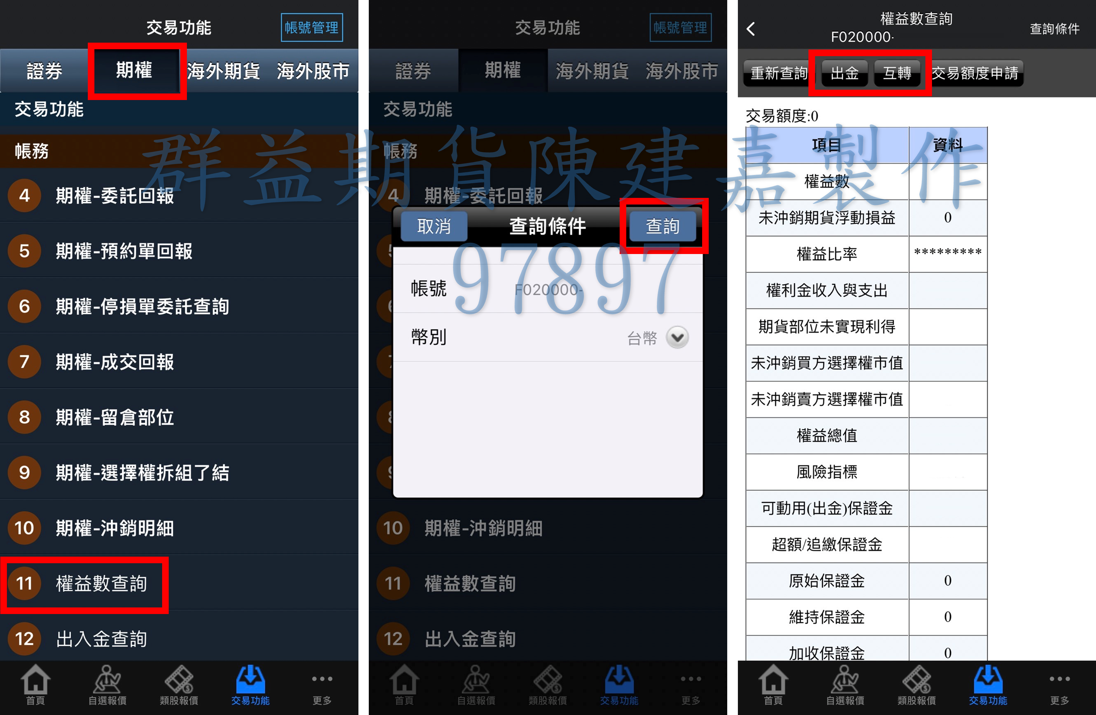 一、登入主畫面後點選期貨交易功能,往下找到權益數查詢,查詢。進入畫面後上方有出金和互轉可以做選擇。