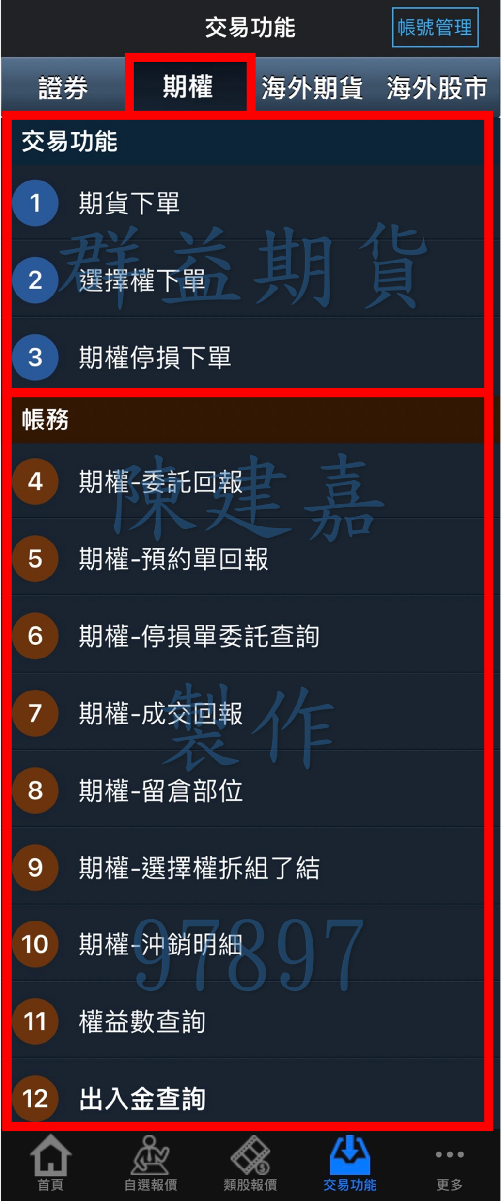 帳務:4.當日委託單查詢/5.當日預約單查詢/6.停損委託單查詢/7.成交單回報查詢/8.留倉部位查詢/9.選擇權拆組(限定日盤)/10.沖銷明細查詢/11.權益數查詢/12.出入金查詢