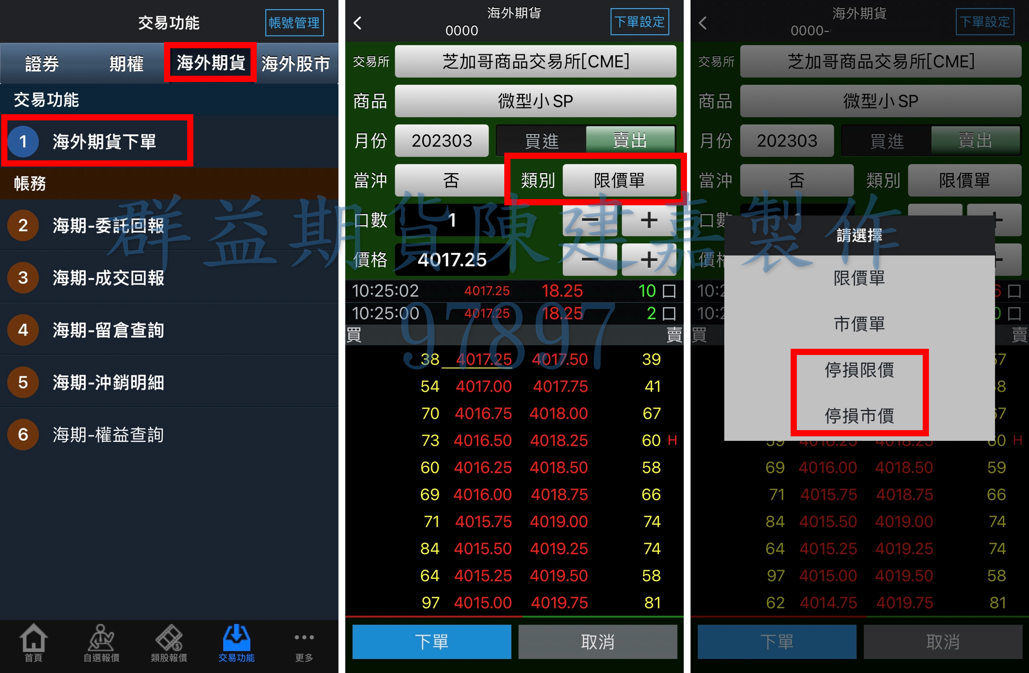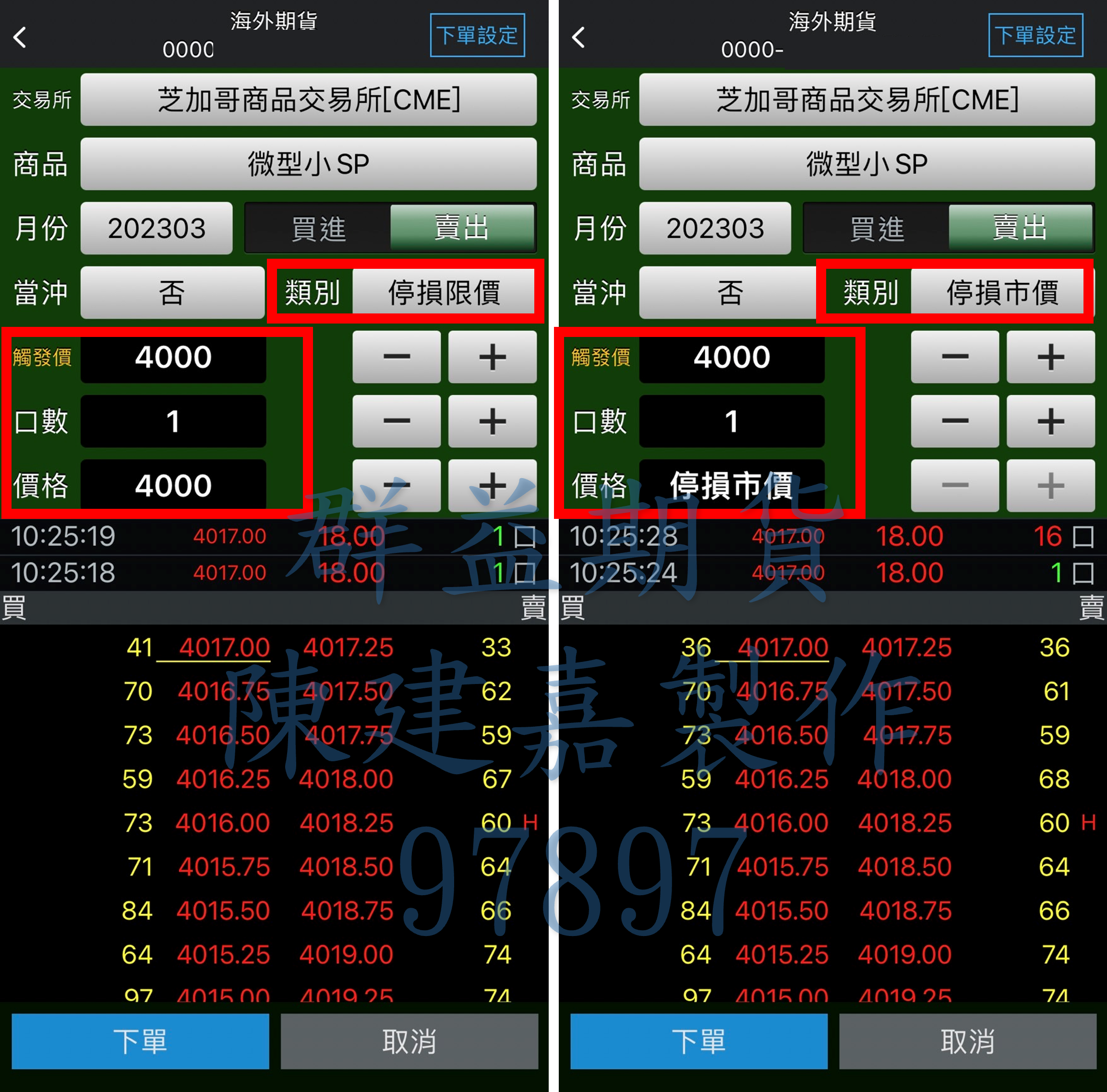 【掌中財神】海外期貨智慧停損單|群益期貨陳建嘉手機APP掌中財神群益期貨手機APP【掌中財神】海外期貨智慧停損停利單;【影音版本教學點此】。 一、登入主畫面後點選交易功能找到海外期貨的交易功能,點選海外期貨下單,海期的停損單是在一般海期下單頁面裡面去做設定,點選”類別旁按鈕”更換停損限價或是停損市價。 二、共有兩種停損單可以選擇,兩個皆需要設定觸發價格; 停損限價:設定好觸發價格後填寫委託價格;舉例觸發到4000時幫你委託送出4000的賣單; 停損市價:設定好觸發價格後幫你用市價委託;舉例觸發到4000時幫你委託送出市價賣單。 以上你已經學會海外期貨智慧停損停利單,如果有不懂或是不清楚歡迎來電討論學習唷! 【影音版本教學點此】 2023.3.2 https://pfsjj.com/wp-content/uploads/2023/03/封面製作077.png 720 1280 jimmy6017211 /wp-content/uploads/2022/12/logo-03.jpg jimmy60172112023-03-02 10:34:182023-03-02 10:34:18【掌中財神】海外期貨智慧停損單|群益期貨陳建嘉